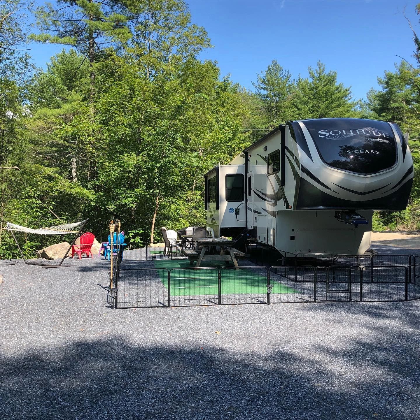There is a fire pit on each campsite, but if you are looking to meet knew people and chat, we have a large community fire pit surrounded by ADK chairs. Perfect for cocktails and s'mores.
